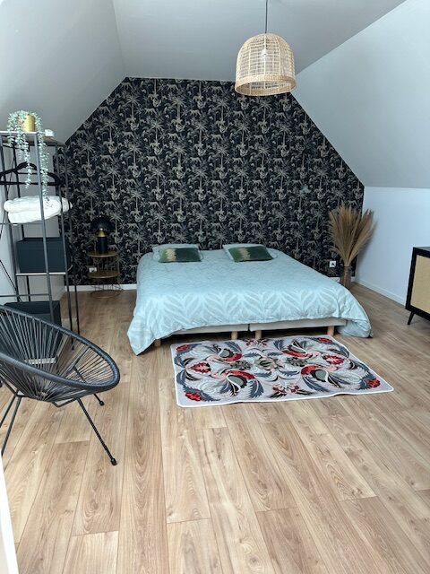 La chambre Eurylaime : chaleureuse et élégante, l’Eurylaime est une chambre au charme unique dans les teintes vert, noir et doré. Son décor raffiné et son atmosphère intimiste en font un véritable écrin où l’on se sent immédiatement chez soi.
